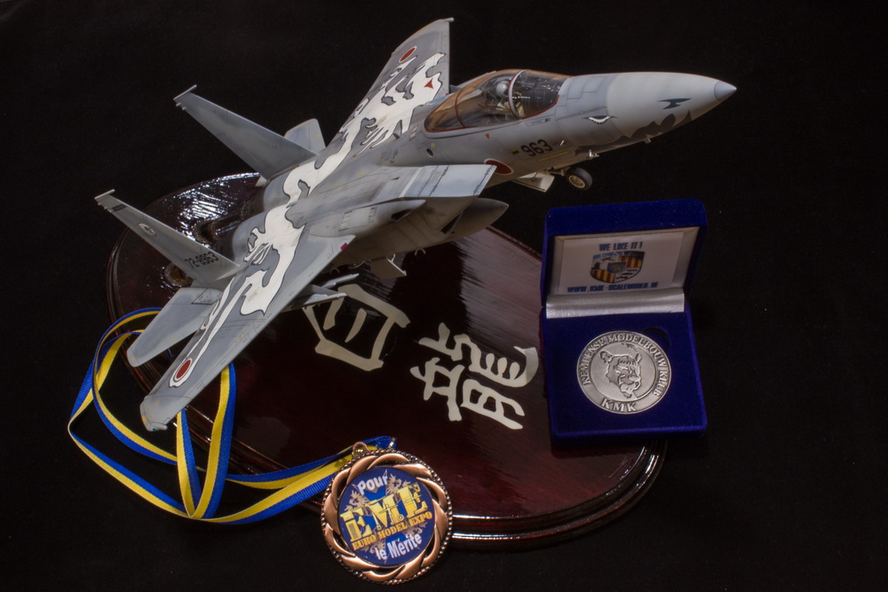 Na poslednjim fotografijama su dva moja takmičarska veterana koja su i ovaj put uspeli da dovoljno šarmiraju žiri, te da osvoje jedno zlato i jednu bronzu. Gostujući klub iz Belgije, KMK, tzv. „Blue Shirts“, koji su po mom skromnom mišljenju imali jedan od najboljih izlozbenih programa, dodelili su i svoju specijalnu medalju maketi koja je privukla njihovu pažnju; ovog puta je to bio baš ovaj japanski F-15 pri strmom poletanju, koga sam napravio pre više od 10 godina.
