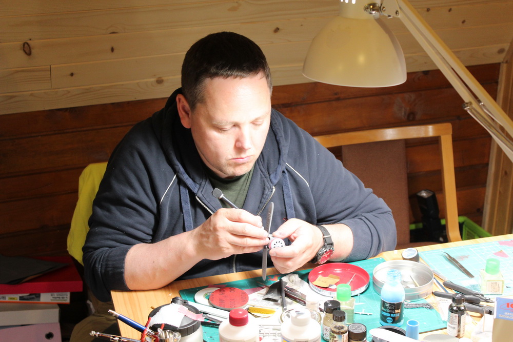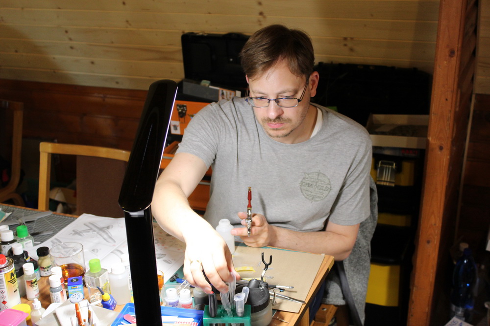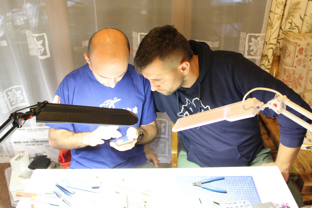 Prvi se za sto vratio profa i nastavio je sa radom tamo gde sam ja stao. Generalno, nas dvojica smo podelili posao na „šasiju“ i „karoseriju“ gde je sklapanje karoserije pripalo meni kao i kompletan rad sa erbrašom dok je profa gulio unutrašnjost i sitne detalje (ima naočare dok moje tada još nisu bile kod mene?). Zahvaljujući njegovom umeću rada sa četkicom, uštedeli smo vreme na farbanju sitnih delova koje je on odlično uradio.