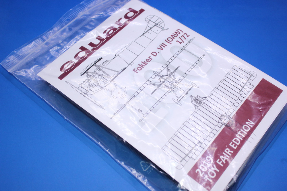 EDUARD je pre koju godinu najavio sasvim novu maketu Fokera D.VII u razmeri 1/72. Nakon nekoliko odlaganja, maketa je doživela veoma lepu najavu u pakovanju koje se delilo na press konferenciji ove firme u toku sajma u Nirnbergu 1.februara 2019. U ovom pakovanju se nalaze četiri rama koja na sebi još uvek imaju tragove ulja od alata, sastavnica A4 formata i „naslovnica“ A5 formata. I to je sve. Nema dekala, maski, eceraja... to sve dolazi u maju mesecu sa ProfiPACK kutijom u kojoj će biti pet odličnih i vrlo inetersantnih šema bojenja ovog poznatog lovca.