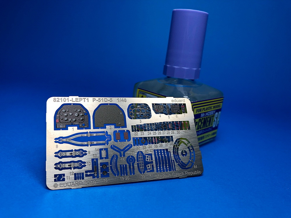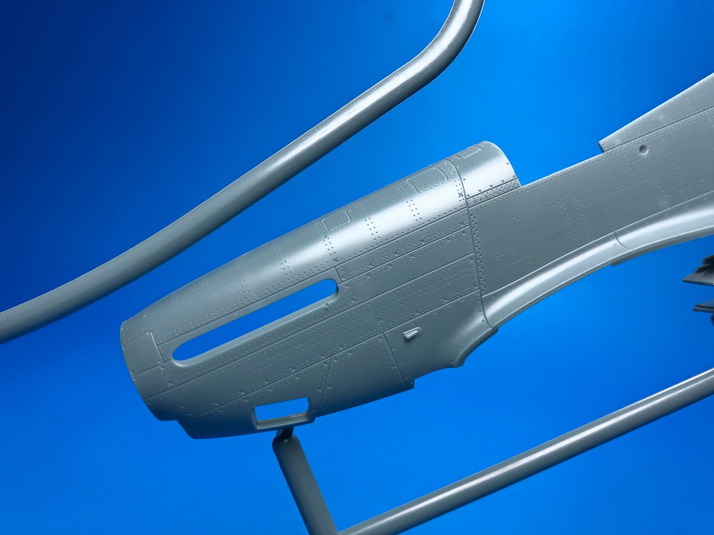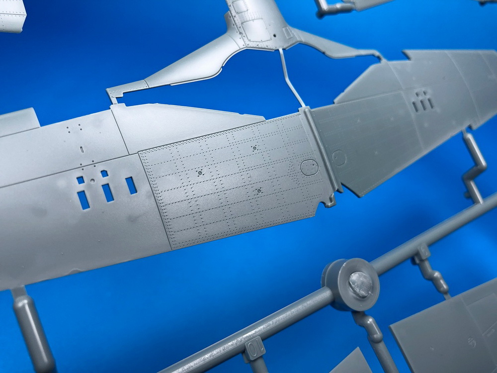 sve podverzije do Bloka30. Ono što je najavljivala ekipa iz Eduarda je i uradila. Naime, nakon svojih opsežnih istraživanja i prilično mnogo razgovora sa maketarima, maketa je urađena sasvim identično pravim avionima koji su bili u upotrebi a u vezi sa čuvenim rivetima na krilima. Pardon, maketa je urađena bez njih. Poznato je da su mehaničari popunjavali i polirali iste kako bi što više smanjili otpor vazduha a samim tim i barem malo podigli brzinu Mustanga. Na delovima makete tj. krilima su prisutne glavne panelne linije (ipak se moralo) dok su riveti izostavljeni. Oni su prisutni na trupu u super finom izvođenju koje je već viđeno na maketama FW-190 i Tempest (lično sam obe uradio (A-4 i Mk.V) te sam tada mislio da je to maksimalno moguće „realno“ prikazivanje riveta i panelnih linija), međutim, sada sam se uverio da postoji i finije! Na fotografijama koje jeuradio Dušan Lekić se nedvosmisleno može videti ta umetnost prikazivanja površine krila i trupa na plastici.