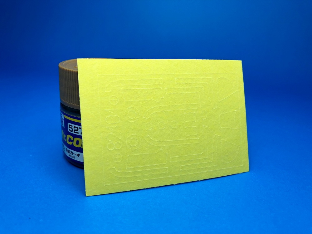 Set maski je na žutom kabuki samolepivom papiru i dobro dolazi za farbanje vetrobrana, poklopca kabine i točkova.
