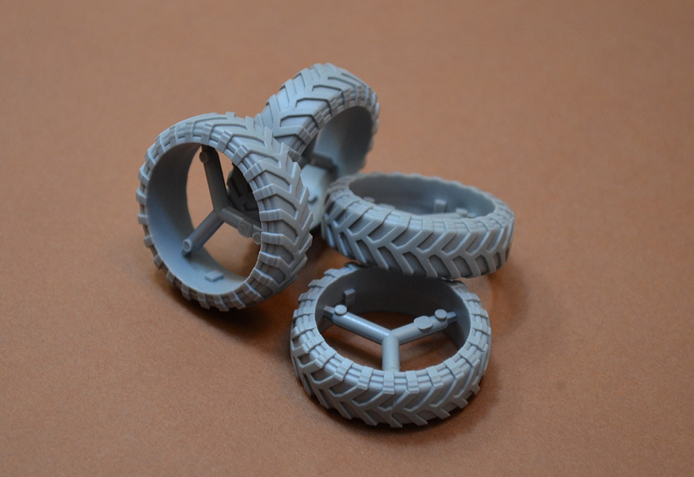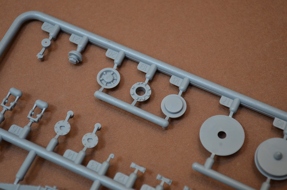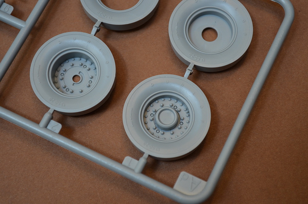 Točkovi su kao i ostatak makete odlično odliveni ali mora se priznati čudnog rasklopa... gazni delovi guma su zasebni delovi a bočne strane guma odlivene su zajedno sa felnama, rešenje koje svakako ne ide na ruku maketarima jer otežava farbanje.