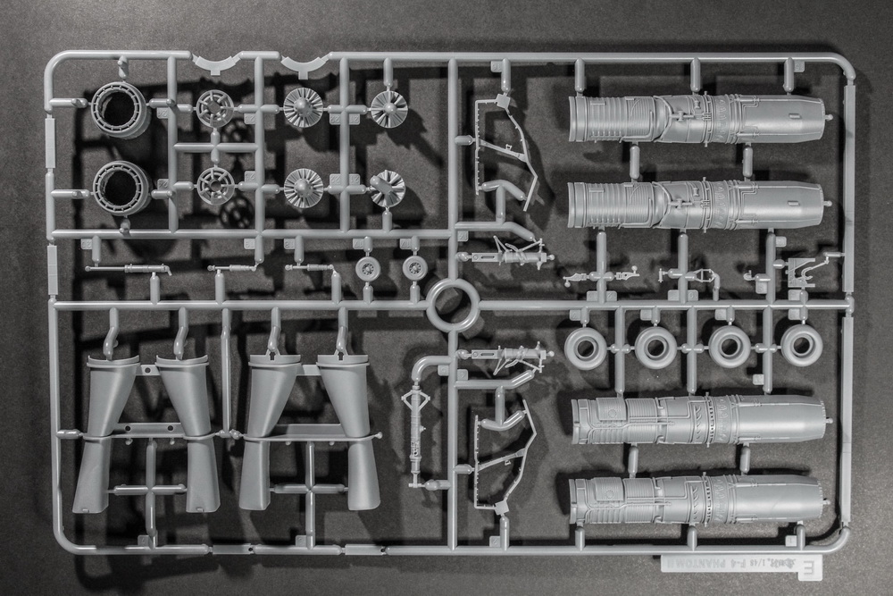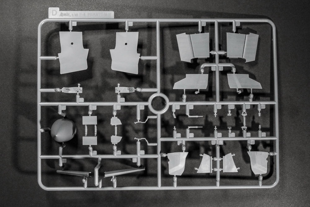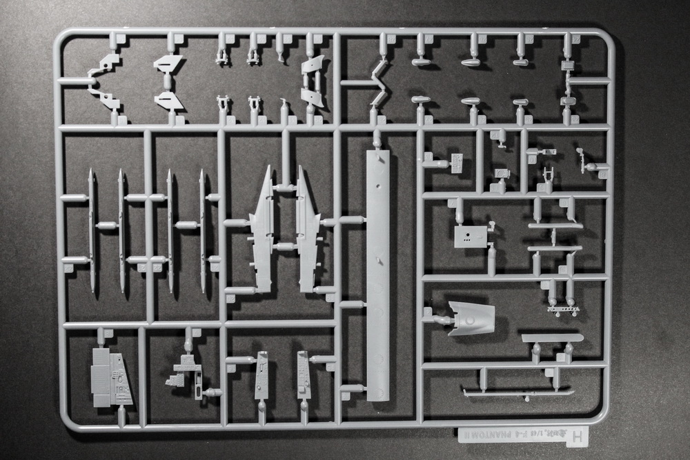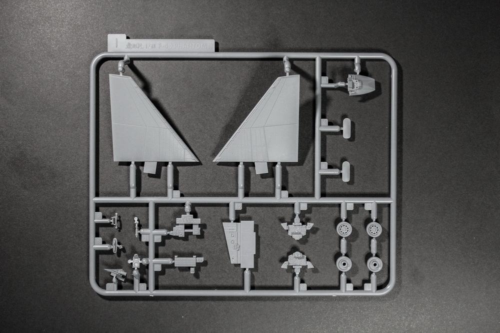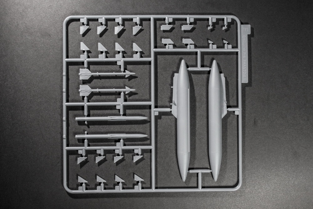Kokpit je sastavljen od preko dvadeset delova, među kojima bih želeo da istaknem kontrolne table koje su zaista impresivne, kao i sva hidraulična creva i kablove koji se nalaze u kabini, koji su skoro pa trodimenzionalni čime se olakšava njihovo isticanje pri radu tehnikom senčenja. Nos je na posebnom ramu odliven sa napadnim ivicama krila i još nekim sitnijim detaljima sa aviona. Što se podvesa tiče, data su dva tanka od 600 galona sa veoma lepim nosačima, pored ovoga u podvezu su još i AIM -7 rakete i to četiri komada kao i AIM – 9 isto tako data u četiri primerka. Motor je predstavljen kao samostalna celina na jednom posebnom ramu, sastoji se od svih uvodnih grana kao i celokupnih motora koji se sastoje od nekolicine delova, sa opet zaista lepim detaljima na površini plastike.