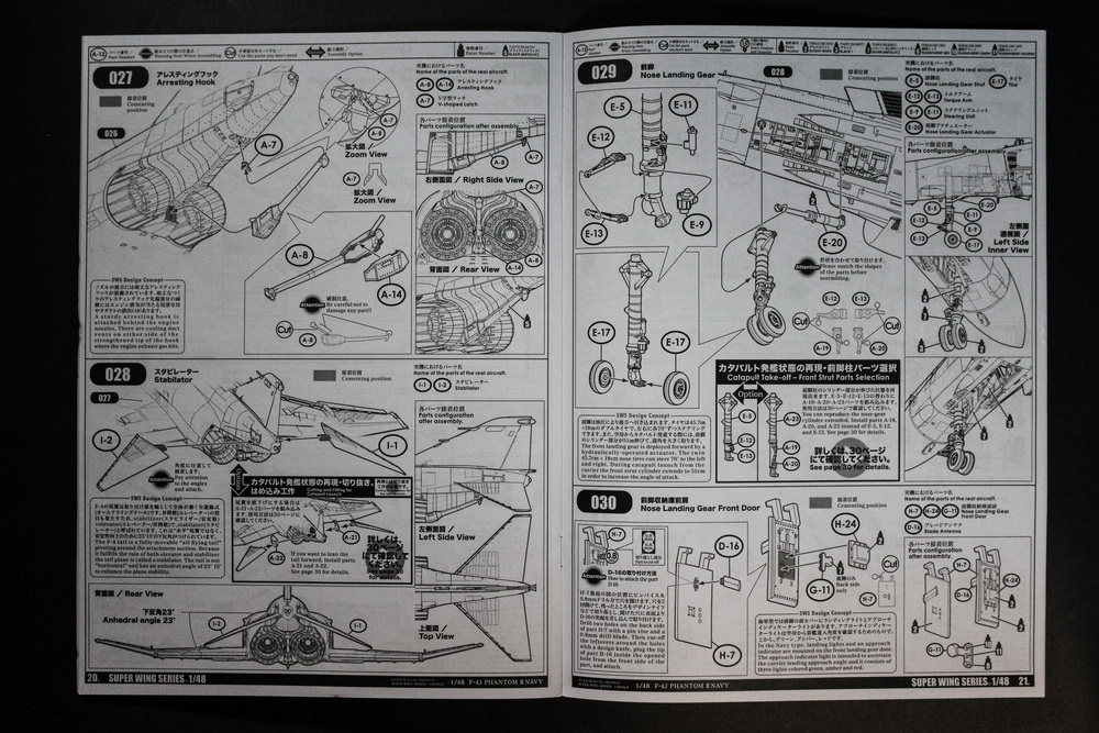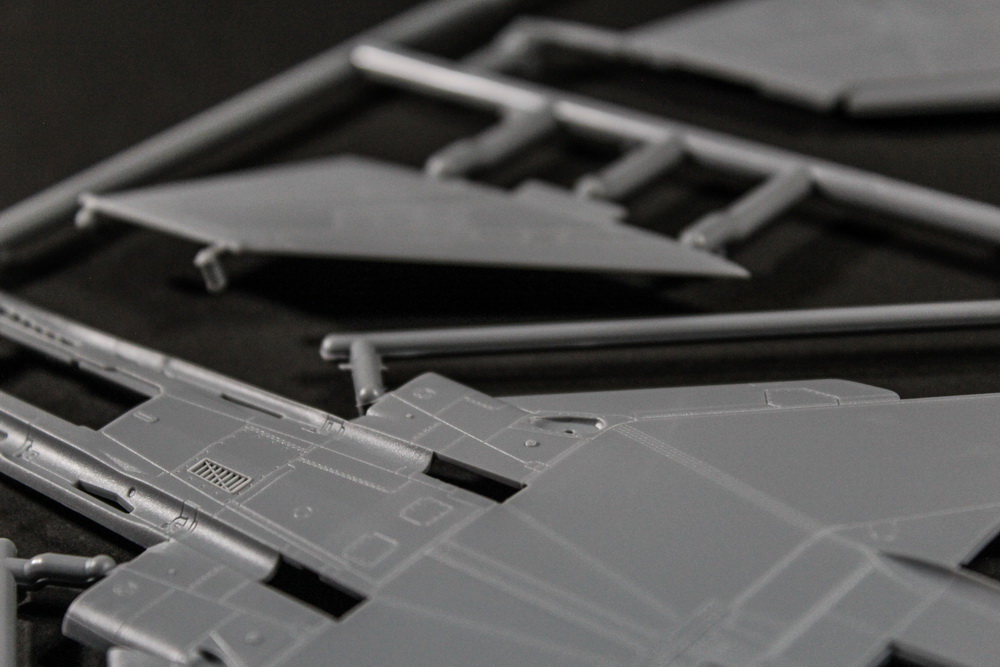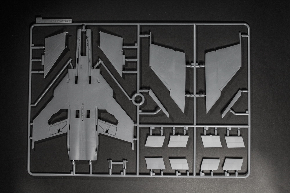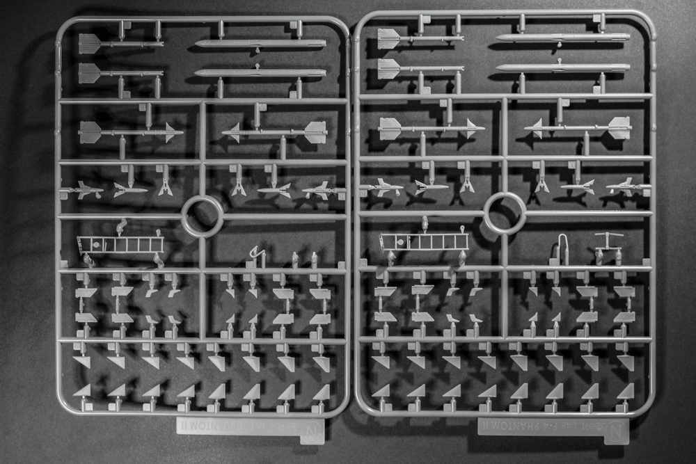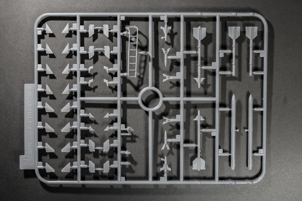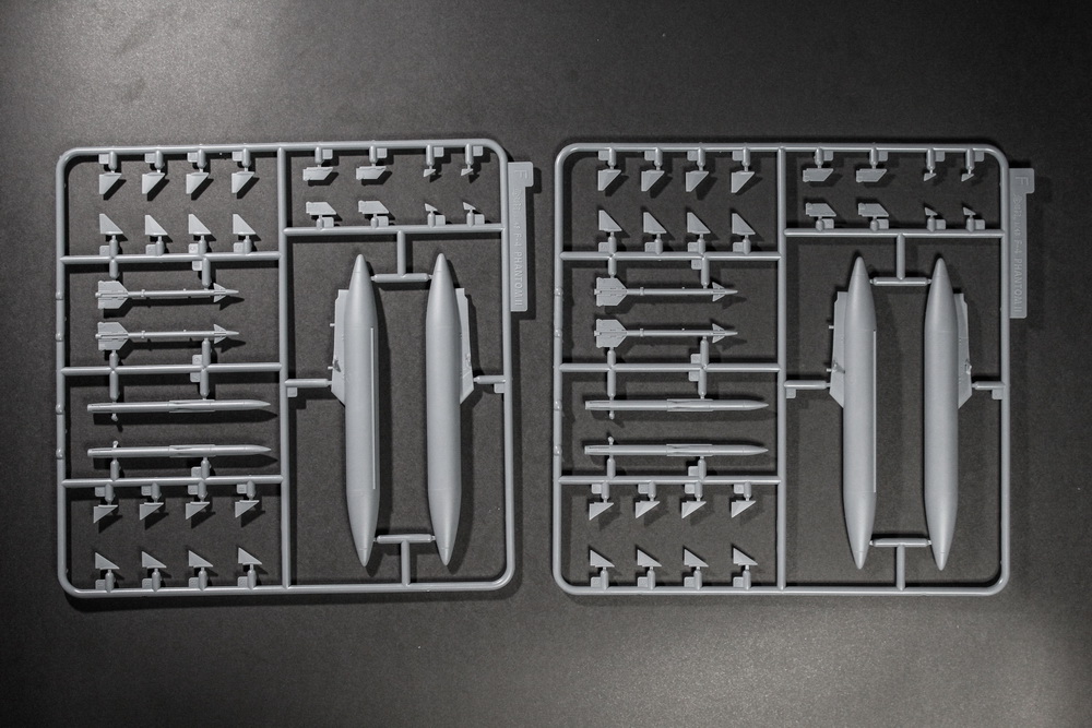 Kokpit je sastavljen od preko dvadeset delova, među kojima bih želeo da istaknem kontrolne table koje su zaista impresivne, kao i sva hidraulična creva i kablove koji se nalaze u kabini, koji su skoro pa trodimenzionalni čime se olakšava njihovo isticanje pri radu tehnikom senčenja. Nos je na posebnom ramu odliven sa napadnim ivicama krila i još nekim sitnijim detaljima sa aviona. Što se podvesa tiče, data su dva tanka od 600 galona sa veoma lepim nosačima, pored ovoga u podvezu su još i AIM -7 rakete i to četiri komada kao i AIM – 9 isto tako data u četiri primerka. Motor je predstavljen kao samostalna celina na jednom posebnom ramu, sastoji se od svih uvodnih grana kao i celokupnih motora koji se sastoje od nekolicine delova, sa opet zaista lepim detaljima na površini plastike.