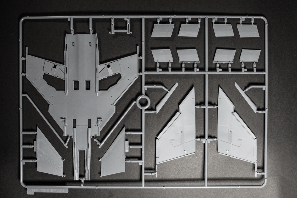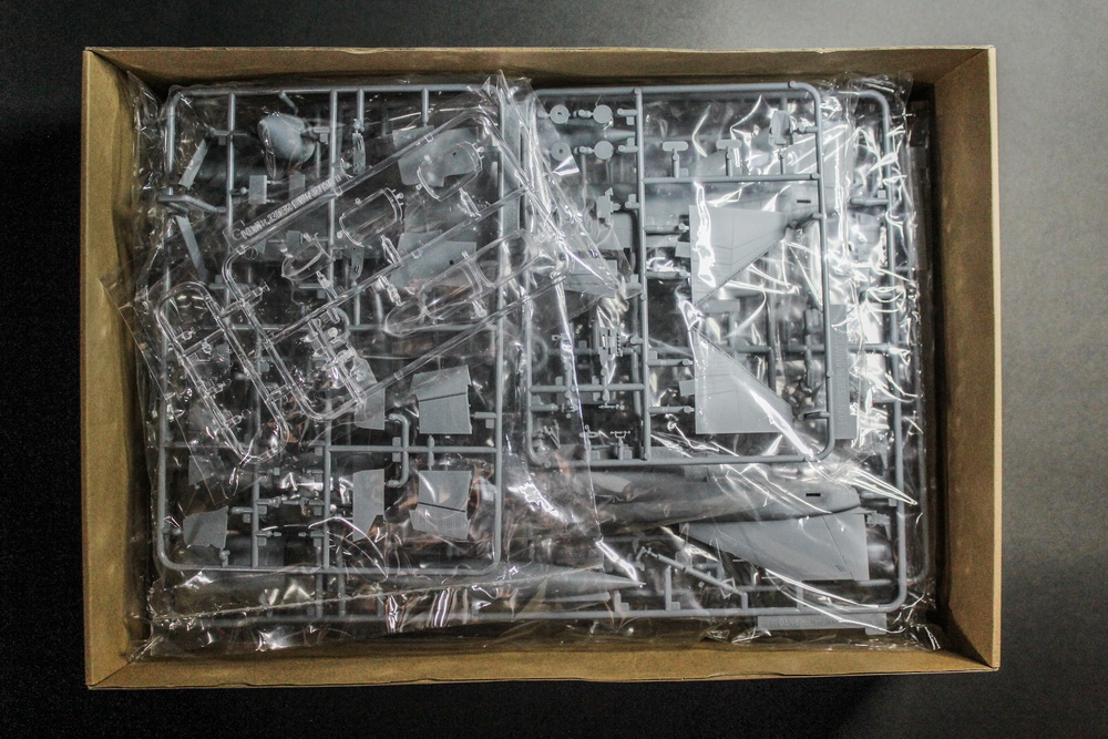 Maketa stiže u tvrdoj kartonskoj kutiji sa gornjim otvaranjem. Na samoj kutiji se nalazi više slika makete sa isticanjem određenih detalja po kojima je Zoukei Mura i poznata. Kutija na sebi nosi ime Super Wing Series broj devet. Naslovna ilustracija predstavlja avion iz Goustrajder(Ghostriders) eskadrile, koji su bili dodeljeni čuvenom nosaču aviona Enterprajz (Enterprice). Izuzetno detaljno predstavljena ilustracija koja nam može biti od pomoći tokom rada na maketi. Sama maketa se sastoji od 381 dela i to sive boje, kao i providnih delova. U kutiji možete pronaći 12 plastičnih ramova od čega je 11 sivih i jedan providan ram. Treba posebno naglasiti da se svaki ram nalazi u zasebnoj kesici čime se dodatno umanjuje mogućnost oštećenja delova rama. Kabinu dobijamo u dva moguća položaja, otvorena koja se sastoji od tri dela i zatvorena koja je predstavljena kao jedna celina. Trup aviona se sastoji iz dva dela, koji su izuzetno detaljno iznitovani sa tri različite vrste nitni kao i panela koji su veoma lepo i suptilno postavljeni po celokupnom trupu. Krila se sastoje od šest delova koji su na ram pričvršćeni na odličnim mestima čime se izbegava mogućnost da se oštete površinski detalji koji su ovde zaista na zavidnom nivou.