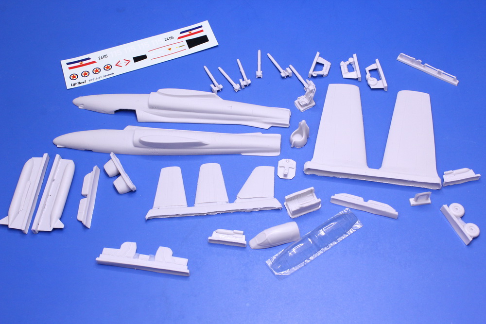 Domaći proizvođač rezinskih maketa AirCast je još 2011. izašao pred maketarsku populaciju sa ovom maketom J-21 Jastreb u razmeri 1/72. Upravo ona je bila prva ozbiljna inkarnacija Jastreba u razmeri koja je privukla priličnu pažnju. A kako i ne bi kada je ova rezinska maketa odlivena u vrhunskom maniru. Na setu fotografija mogu da se vide delovi koji po kvalitetu odlivka staju uz rame sa najpoznatijim svetskim proizvođačima rezinskih maketa. Pregledom delova sam ustanovio da nema ni jednog polomljenog dela, nema ni čuvenih mehurića koji su verni pratioci ovog materijala a detalji na oplati trupa i nosećih površina su prilično ujednačeni. Proizvođač je zaista uspeo da u ovoj „maloj“ razmeri i tradicionalno neugodnom materijalu za izradu proizvede set delova od kojih može da se napravi, siguran sam u to, sasvim dobra maketa J-21 Jastreba. Rasklop je u tradicionalnom maniru sa dve polutke trupa u koji se dodaju delovi kabine (odlično izliveno katapult sedište sa vezovima i instrumentalna tabla) te po sklapanju i krila sa vertikalnim stabilizatorom (koji je posebno dat) i horizontalnim repnim površinama. Vrlo lepo su urađene i noge stajnog trapa koji je malo robusniji i kod pravog aviona a sami točkovi mogu po izgledu i detaljima da pariraju plastici bez problema.