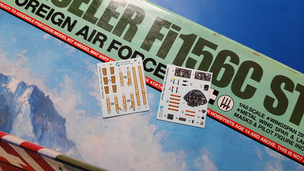 QUINTA STUDIO je firma koja se dokazala sa svojim odličnim 3D setovima za doradu kabinskih delova na maketama. Jedan od njih je i set za doradu kabine Tamijine makete Fi-156 Storch u razmeri 1/48. Set (QD 48078) se sastoji od dva lista na kojima su 3D dekali za (prvi list) lice instrumentalne table, radio uređaja i kompasa, zatim ručice, ventili, kožni vezovi na papučicama komandi pravca, prekidači za vezu i (drugi list) komplet gurtni (vezova) za pilotsko i dva pomoćna sedišta. Dekali se postavljaju na već ofarbane i lakirane (sjajnim lakom) delove (od papirnog nosača se odvajaju u toploj vodi u roku od 10ak sekundi, lepim ih sa gel super lepkom) te se potom vrši postavljanje tih delova na svoja mesta. Osim lica instrumentalne table, sve ostale delove sam nakon završene postavke preprskao tankim slojem mat laka. Quintini 3D dekali su odlično skrojeni i veoma dobro reaguju na maketarsku hemiju.